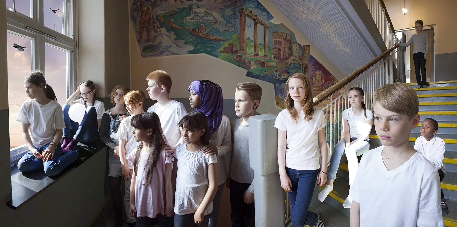 The new Harstad school was completed in 2018. I delivered 2 different motifs as commissioned works. I used the old school as a location, and took staged photos of the students who attended there.